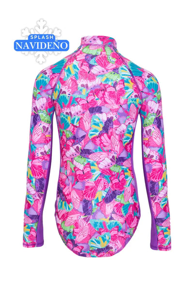 El modelo FAIRY WING con diseño de mariposas combinado en colores rosa,lila, morado, rosa,  en tela brillante haciendo que las niñas luzcan divinas sobre todo con la luz de sol.